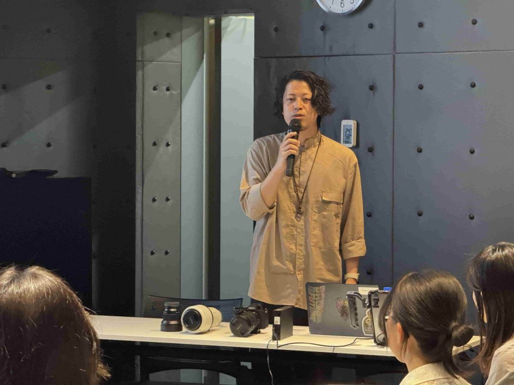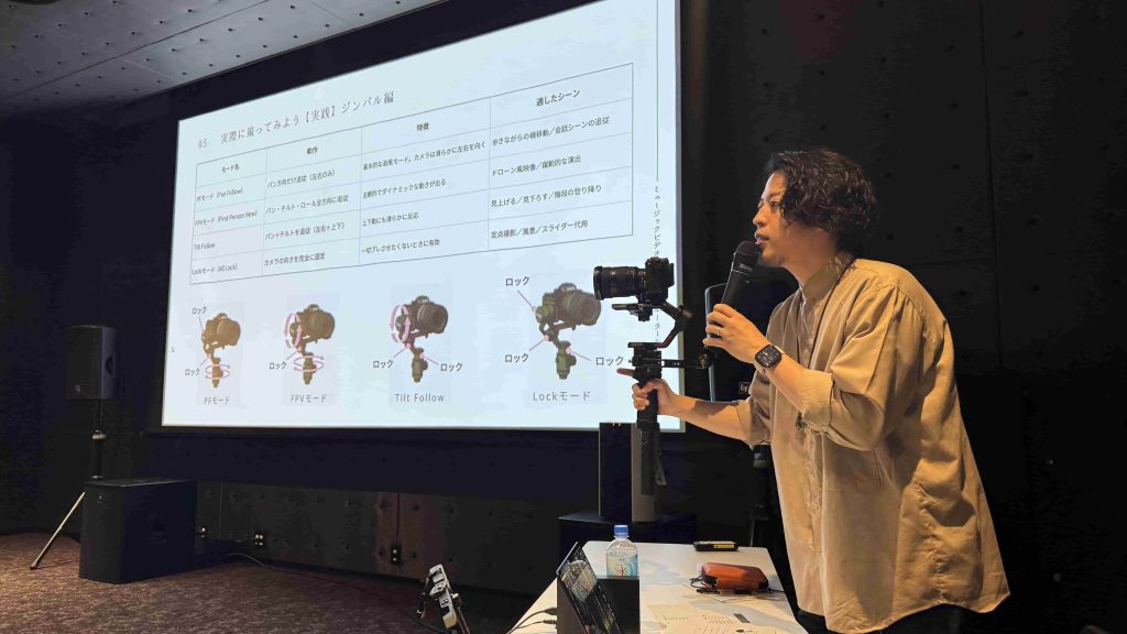 さらに、使用している機材の説明や、カメラ設定(ISO・シャッタースピード・ログ撮影など)についても初心者にもわかりやすく紹介していただきました。