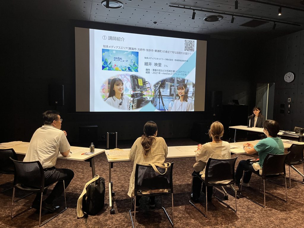 細井さんは、知多メディアスネットワーク株式会社が放送する「メディアスエリアニュース」の記者です。この日は、細井記者が取材した映像を視聴しました。細井記者は、1人でカメラを撮影しながら、原稿を作成するときに必要な情報も同時に集めていく事を話してくれました。