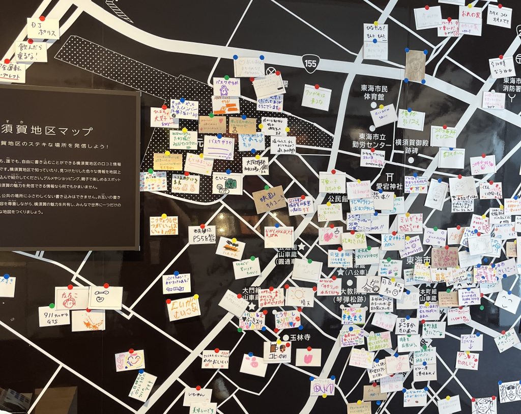 この地図ボードは、いつでも、誰でも、自由に書き込むことができる横須賀地区の「クチコミ情報マップ」です。横須賀小学区の卒業生のメッセージや、グルメ情報、山車やお祭りの思い出などたくさんのメッセージありがとうございました。定期的にメッセージを回収し、スタッフにてファイルに取り込みをし、閲覧できるようにしました。(写真)これからも、横須賀地区の魅力を共有し、みんなで世界に一つだけのステキな地図で ”交流” しましょう。